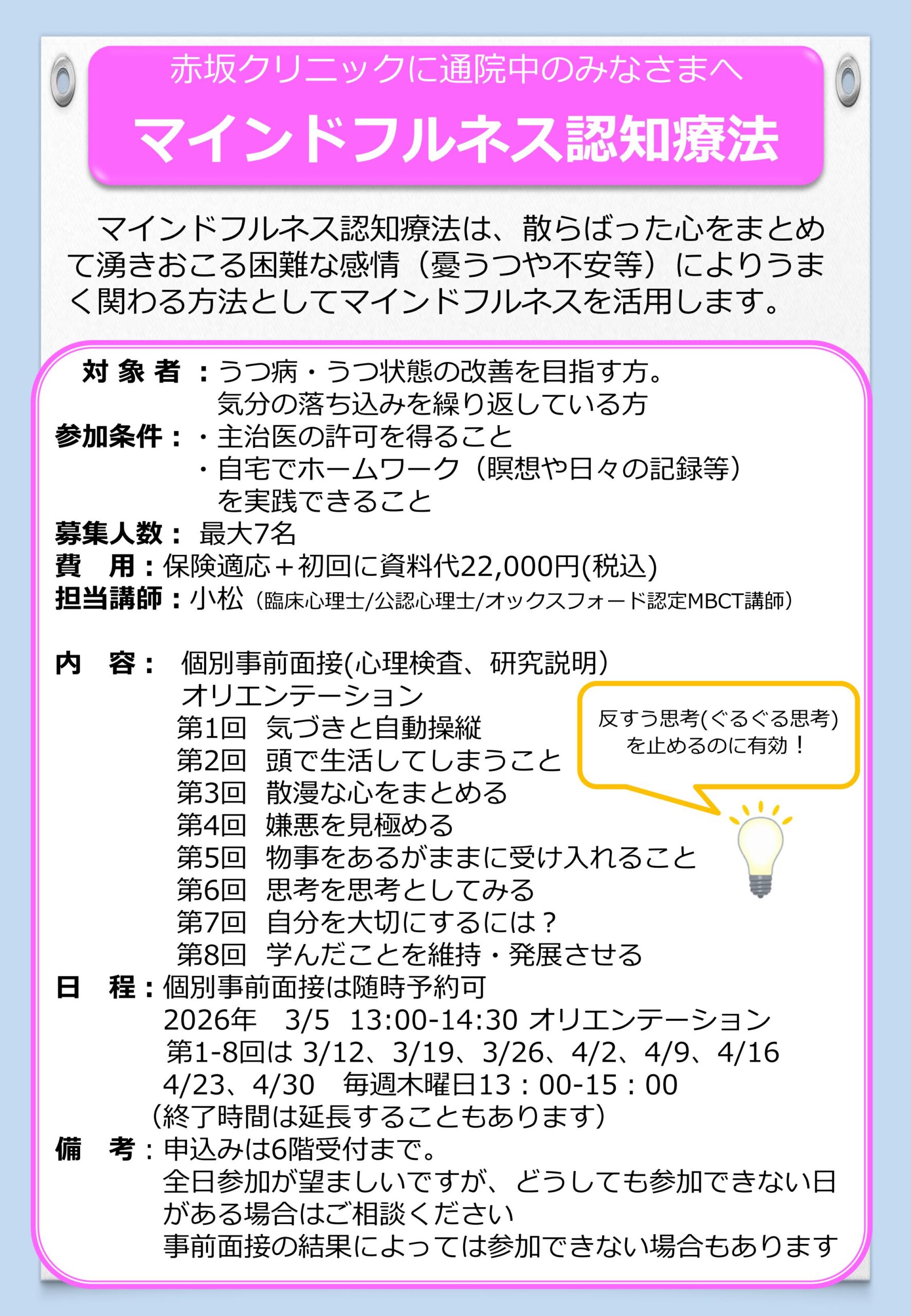 マインドフルネス認知療法 2026年3月~4月 参加者募集中